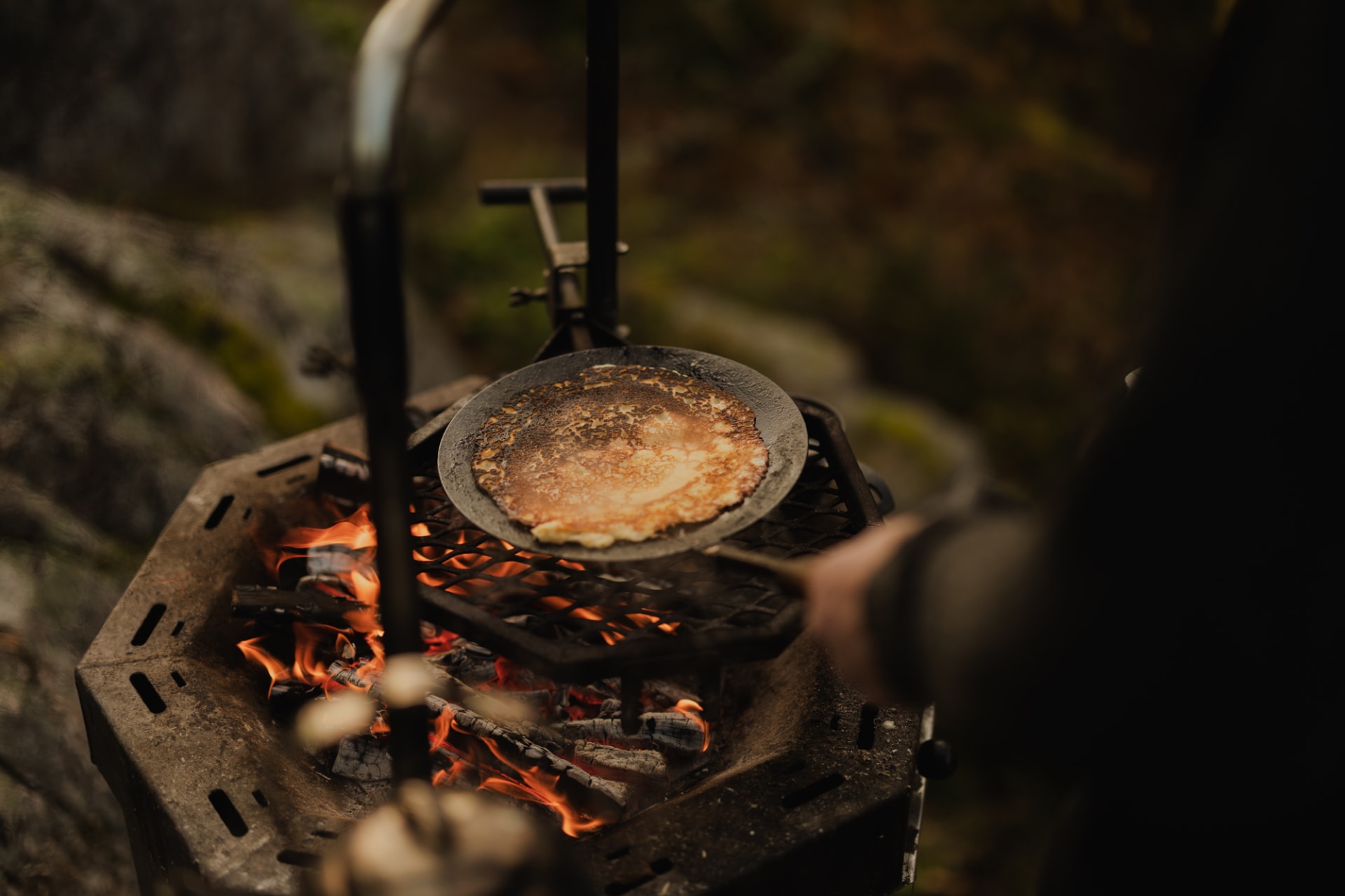 ja avotulella paistetut pannukakut tuoreilla marjoilla maistuvat
